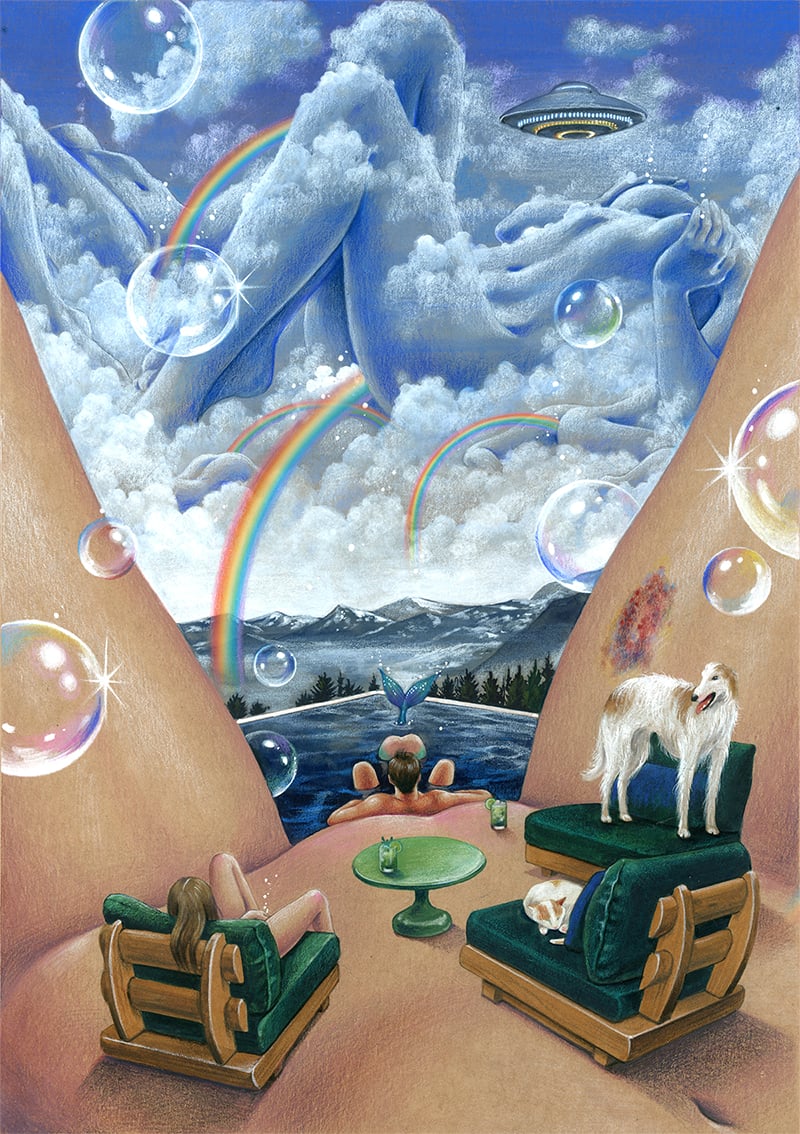 Watercolor, acrylic, colored pencils on paper of 380g